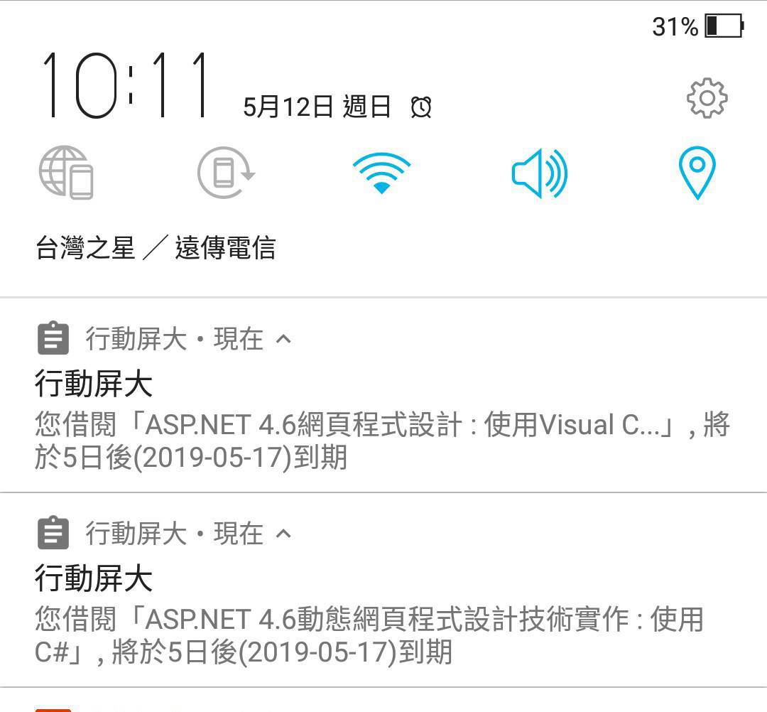 在行動屏大APP裡的圖書資訊,設定帳號密碼後,即會在圖書到期日前及有預約書到館時推播,除Email提醒外的另一種通知,請各位多加利用。